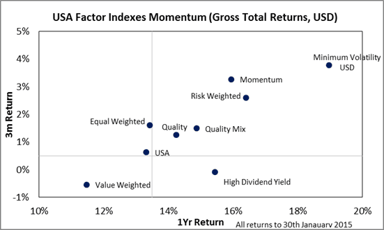 As a result, investors responded by becoming even more risk averse. The MSCI USA Minimum Volatility Index, which tends to outperform when investor risk aversion increases, has now outperformed the MSCI USA Market Cap benchmark by more than 3% during the three month period ending January 30th, 2015, as can be seen in the exhibit below.
