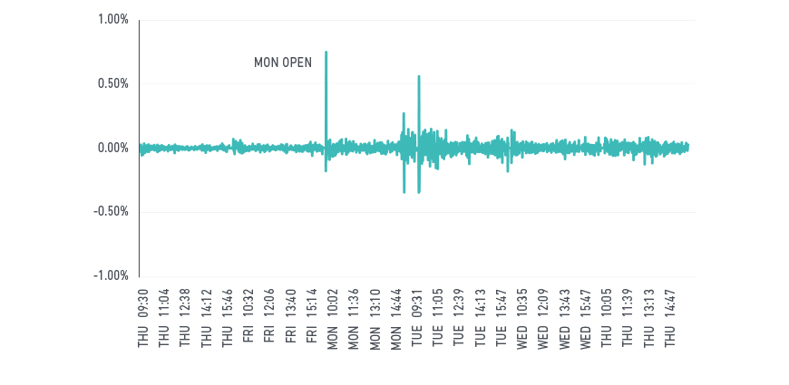 How did different equity factors fare during the past week's market turmoil? When markets are gyrating, it can be difficult to figure out just what is happening. Real-time data provides greater insight into market events as they unfold. What we observed was a shift in the U.S. stock market. The market began tumbling on Friday, Feb. 2. By Monday, investors started rotating out of stocks that were more sensitive to the market ("high beta stocks") to safer, lower volatility stocks. At the same time, volatility — as measured by the VIX — spiked. Earlier this week, we looked at how this heightened market volatility affected various sectors and factors. Now, we look at how real-time data provides deeper insights into the rotation that occurred between the minimum volatility and momentum factor indexes. We use MSCI Real Time Indexes to analyze the data. The exhibit below traces the minute-by-minute return of the MSCI USA Index over the course of the week. Four periods stand out where returns swung sharply: the market opens of Friday, Feb. 2 and Monday, Feb. 5; the afternoon of Monday, Feb. 5, and the open of Tuesday, Feb. 6. Notably, while volatility was elevated from Tuesday through Thursday, no distinct period stood out. What conclusions can we draw into the relative performance of low volatility and momentum strategies?
