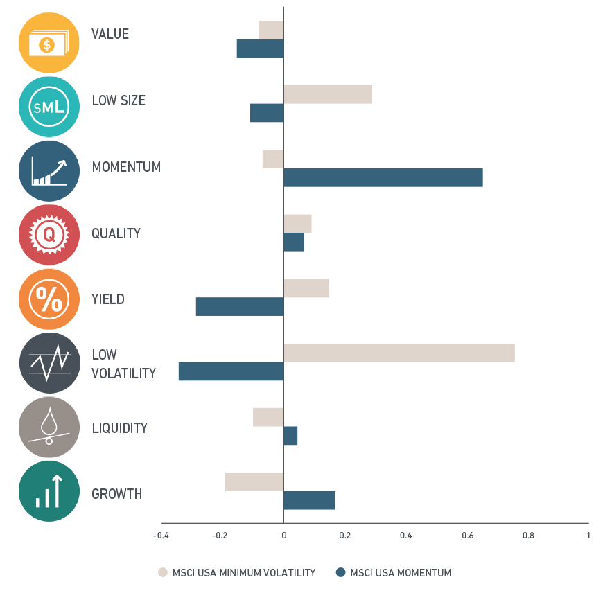 FaCS factor exposures of the MSCI Momentum and Minimum Volatility indexes