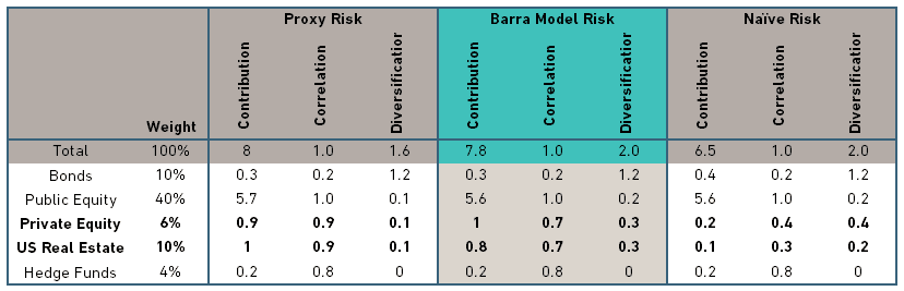 Modeling the first component, debt, is relatively straightforward, either as simple leverage or as funding instruments exposed to the risk factors of the MSCI's fixed income risk models. The other two are far more challenging. Accurately modeling these components requires private real estate data and a statistical methodology that can see past the smoothness of the valuations. These features are incorporated into the Barra Integrated Model, which spans global stocks, bonds, commodities, currencies, volatility futures, hedge funds and private equity. The model's Bayesian desmoothing methodology reveals a significantly higher level of commonality between private real estate and other asset classes. Despite this commonality, however, the utility of other asset classes as proxies for private real estate is limited. The use of tenancy and lease information to map real estate to equity and bond market factors is tenuous. These factors can be important ingredients in forming a view on a property's expected return, but they fail to capture real estate risk. Although there is commonality with both stocks and bonds, the majority of real estate risk is driven by endogenous factors. Ultimately, real estate is its own asset class. As can be seen in the below exhibit, proxies for private assets suggest they provide little diversification, while the smooth valuations (based on lagged appraisals of direct holdings) naively suggest private assets contribute very little risk. The reality is in the middle. Private assets have offered diversification benefits, but they have also been cyclical and exposed to some of the same systematic risks driving other assets' performance. What is the True Degree of Private Asset Risk?