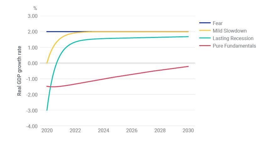 The growth paths for various shock scenarios plotted relative to a 2% annual real growth reference scenario. In the model, a 5% drop in short-term growth expectations and .5% drop in trend would change 2% expected growth to a -3% contraction for 2020. In the absence of a change in trend growth, the economy would recover quickly to the baseline growth rate, but the trend shock in the "Lasting Recession" scenario leads to drag on the economy for the decade ahead.