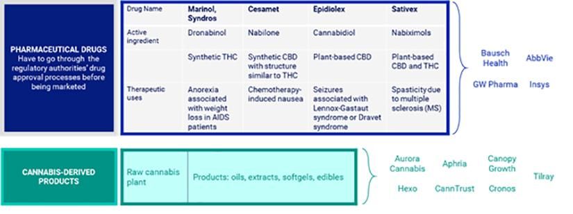 To date, the U.S. Food and Drug Administration (FDA) has approved just one cannabis-derived prescription drug (from GW Pharma) and three cannabis-related ones (from AbbVie, Bausch Health and Insys). Most of the healthcare companies involved — such as Canopy Growth or Aurora Cannabis, which produce medicinal supplements that are generally high in CBD but contain little or no THC3 — have not received regulatory approval. For these companies, the ESG risk profile is unique and evolving: