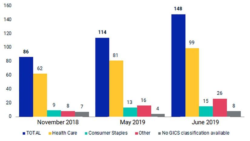 Corporations are weighing the opportunities. As of June 3, 2019, most companies involved with cannabis were in the healthcare (71%) and consumer-staples sectors (11%) – primarily pharmaceutical and beverage firms, plus a handful of tobacco companies. With continued high growth expected for both the medical and recreational markets,2 as well as continued deregulation, medical cannabis companies may also be preparing to launch or ramp up recreational operations.
