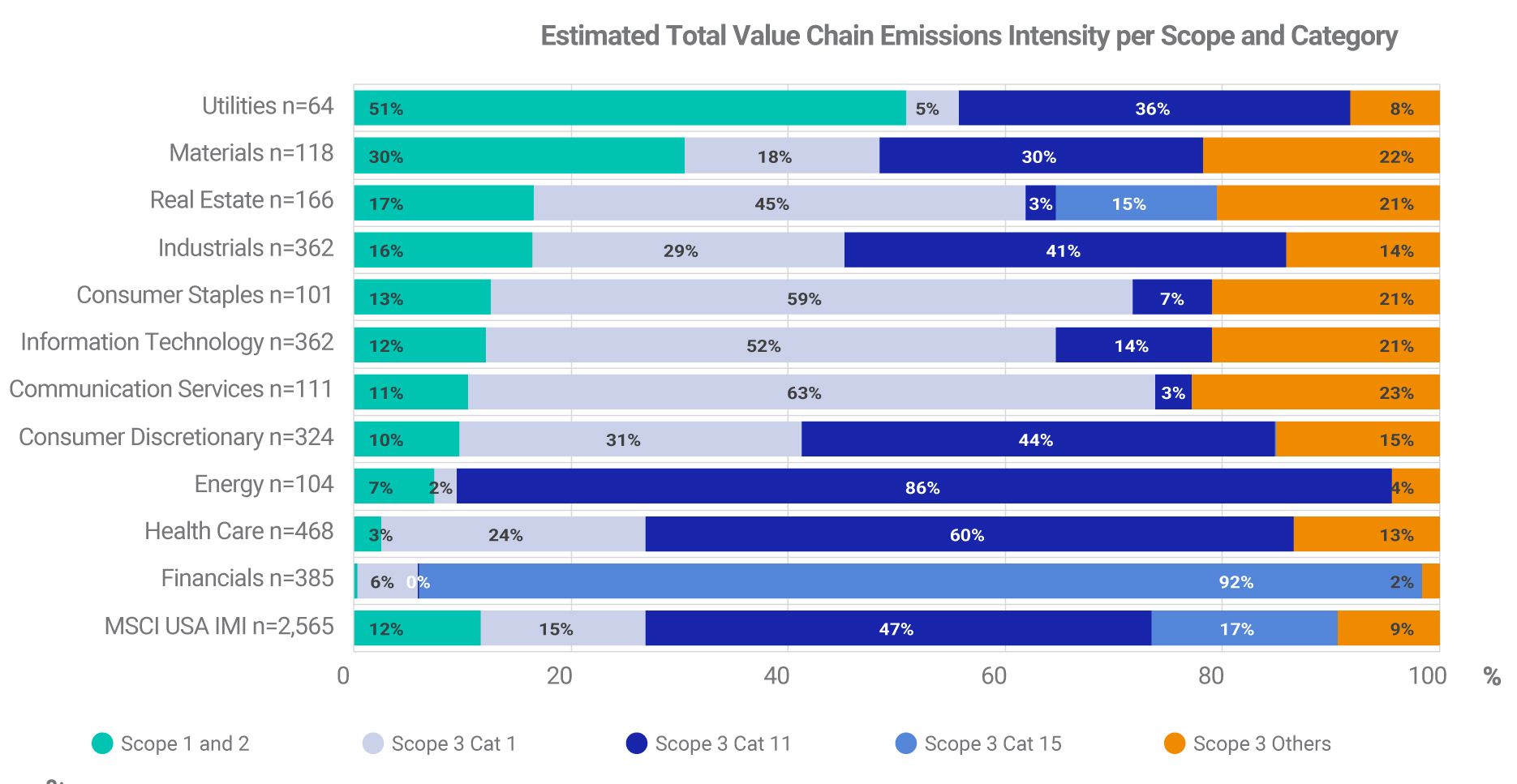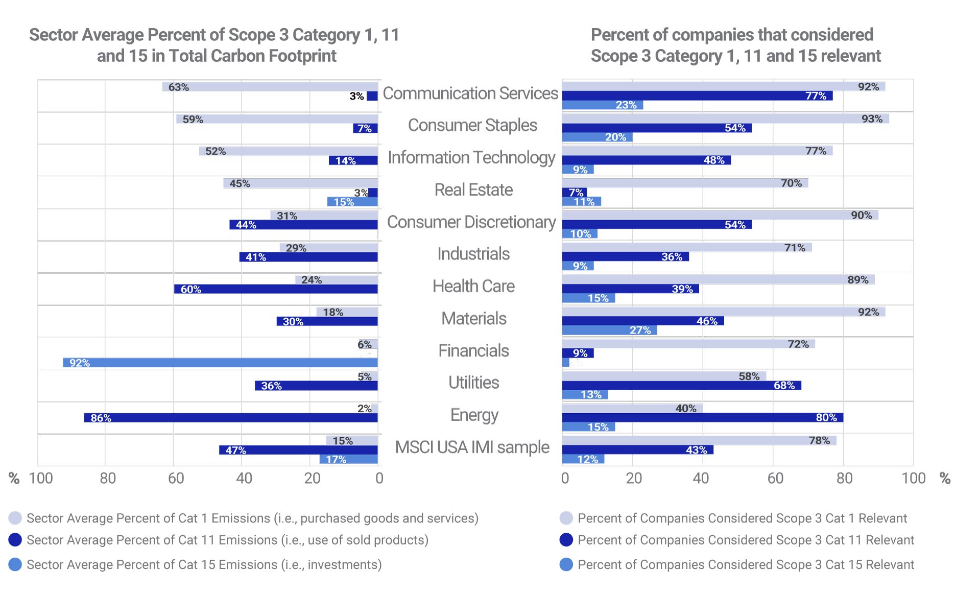 - Three categories of Scope 3 emissions — purchased goods and services, use of sold products and investments — contributed over 70% of the total carbon footprint for constituents of the MSCI USA Investable Market Index.