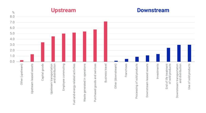 Scope 3 emissions contain 15 categories, to cover specific upstream and downstream value-chain activities. For example, "business travel" (category 6) is upstream and "use of sold products" (category 11) is downstream. Source: MSCI ESG Research LLC, MSCI ACWI IMI constituents as of March 31, 2020