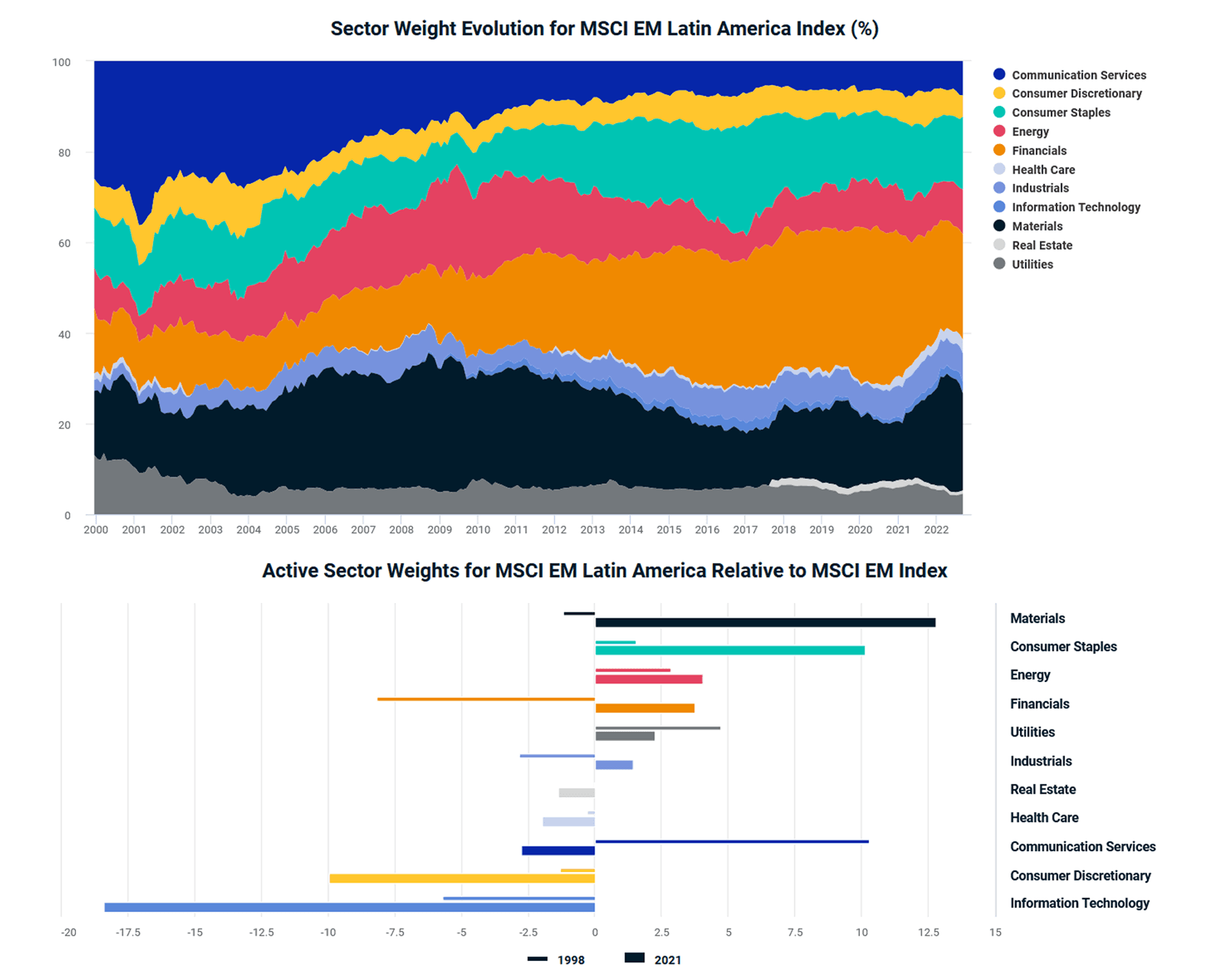 The drivers of Latin America's economies have significantly changed over the past two decades, as we can see clearly by looking at the sector composition of the Latin American stock market. Materials, financials and consumer staples, the three top-performing sectors in the region since December 1998, have grown in prominence over the last 20 years, largely at the expense of the communication-services sector.