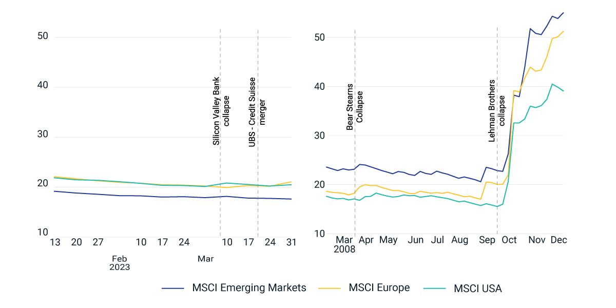 Equity volatility rose modestly after recent bank collapses, compared to 2008 Lehman collapse