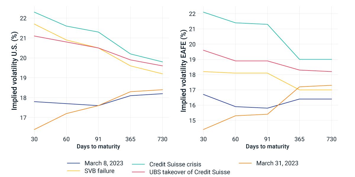 Implied-volatility term structures are based on the implied volatility of 50-delta call and put options. Options linked to the MSCI EAFE Index and S&P 500 have been used for the EAFE and U.S. calculations, respectively. SVB failure, Credit Suisse crisis and UBS takeover of Credit Suisse correspond to March 10, March 15 and March 20, respectively. Source: OptionMetrics