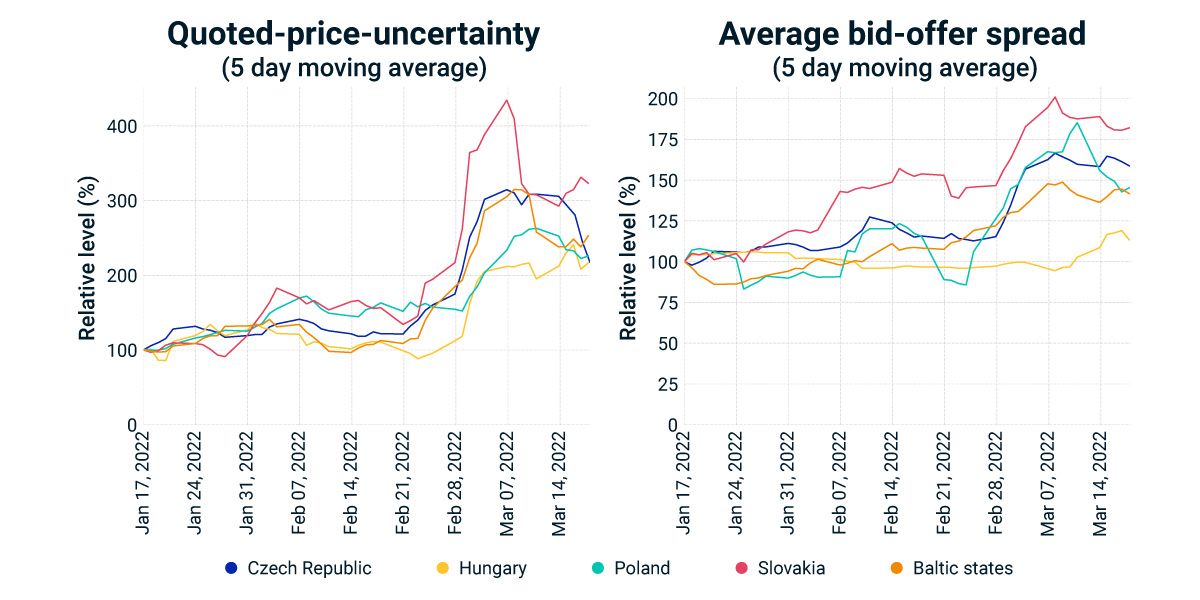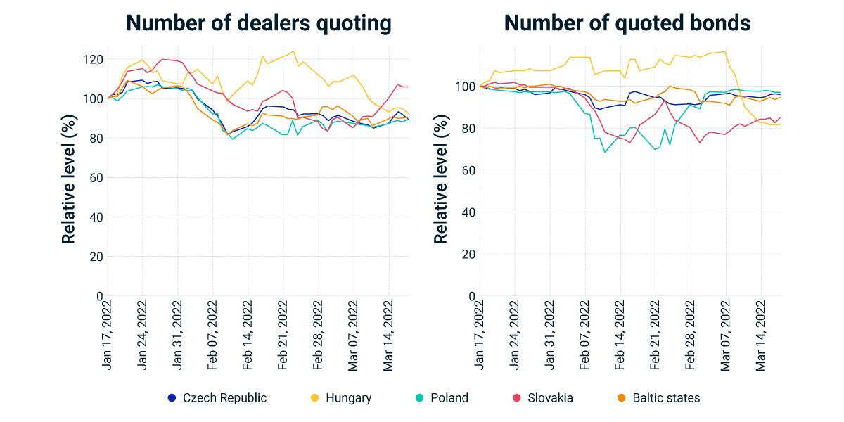 Following up on our earlier research on contagion indicators, we looked at how the liquidity of corporate bonds from Eastern European countries (the Czech Republic, Hungary, Poland, Slovakia and the Baltic states) has changed since the start of the Russia-Ukraine war.