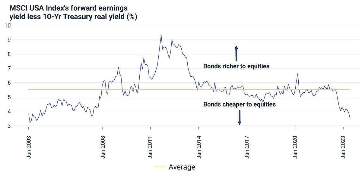Some investors may see this year's relative underperformance of bonds and wonder whether there may be opportunity. Real bond yields continue to be high relative to the 10-year average. And by some historical measures, bond-market valuations look low relative to equity valuations.
