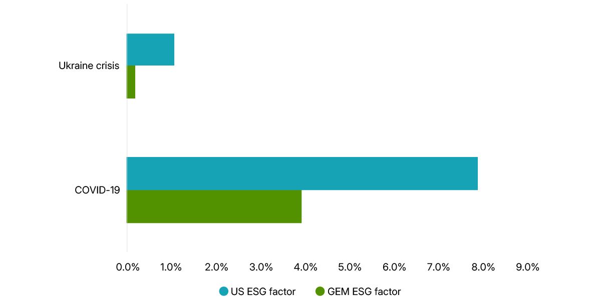 The chart shows the MSCI Barra Equity Model ESG factor returns (annualized in %). The ESG factor return represents the performance of companies with higher ESG scores relative to those with lower ESG scores, after controlling not only for well-known systematic sources of return — such as size, volatility, industry or country membership — but also for numerous other potential factors. Ukraine crisis refers to period from Feb. 23, 2022, to May 31, 2022; COVID-19 refers to period from Dec. 31, 2019, to April 30, 2020. Source: MSCI ESG Research