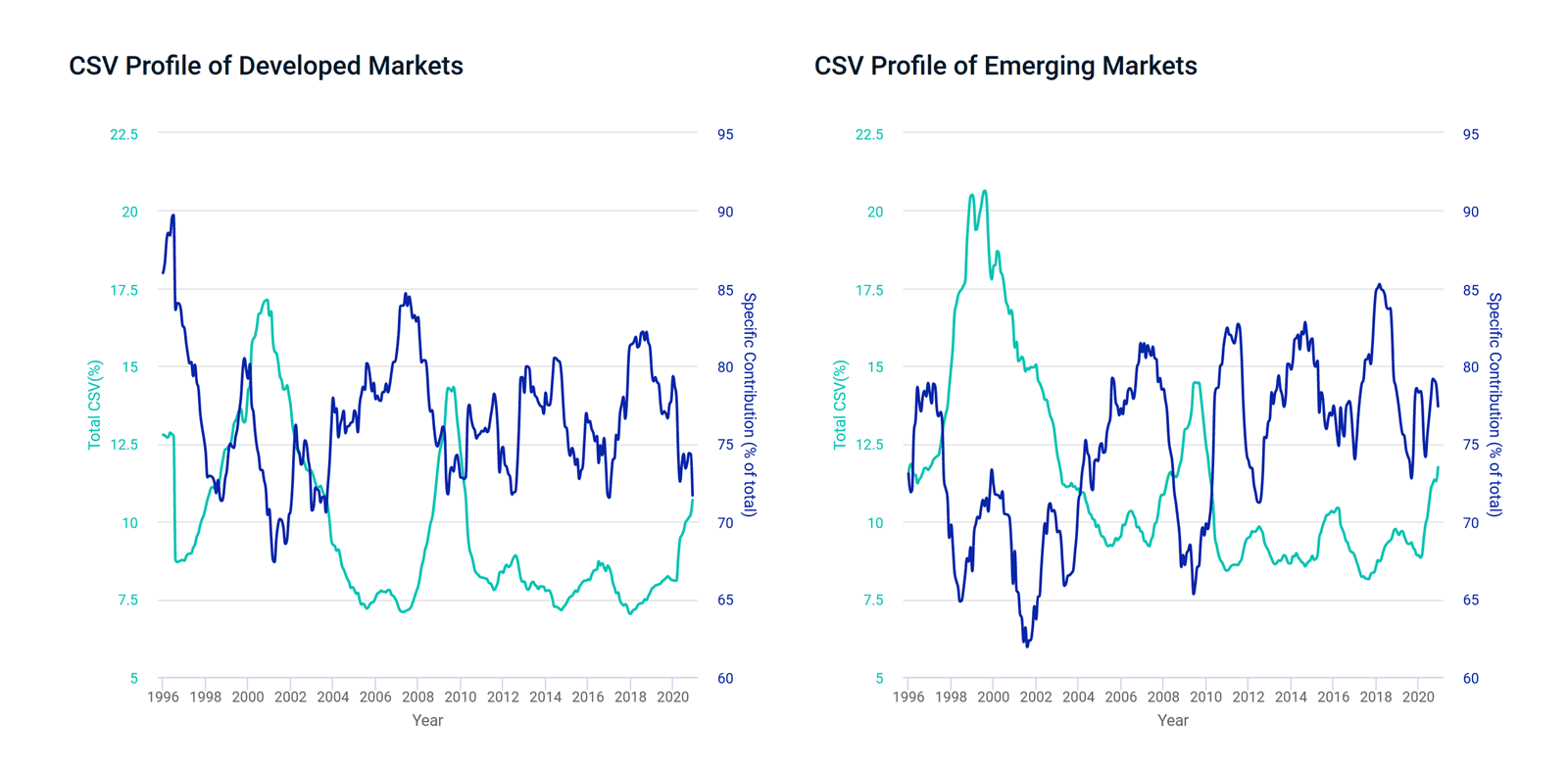 Data from Dec 29, 1995, to Nov 30, 2020. Cross-sectional volatility (CSV) is the standard deviation of a set of asset returns over a single time period and over time. Please note our plots show the 12-month average CSV referenced in "Selected geographic issues in the global listed equity market" (opens in a new tab).