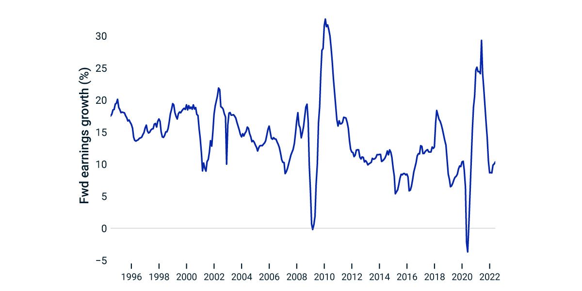 Earnings estimates have fallen for U.S. firms recently with a slew of downward revisions,1 possibly indicating that recession fears may be influential. Equity analysts anticipate that U.S. corporate earnings will increase by about 10% this year, which is a sharp departure from last year's growth spurt (as shown below).