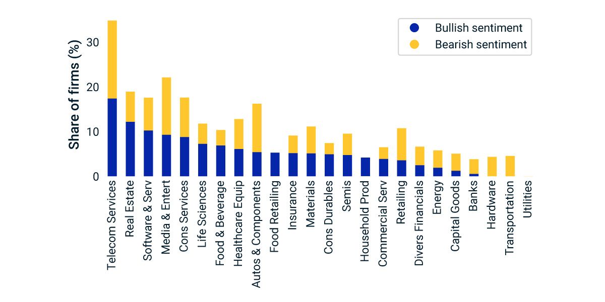 We found that certain industry groups, such as telecommunications, real estate and media and entertainment, had a relatively high share of companies where analysts were currently most bullish. To be sure, these industry groups also had a high share of firms that analysts were most bearish on, which may be a ripe opportunity for stock picking.