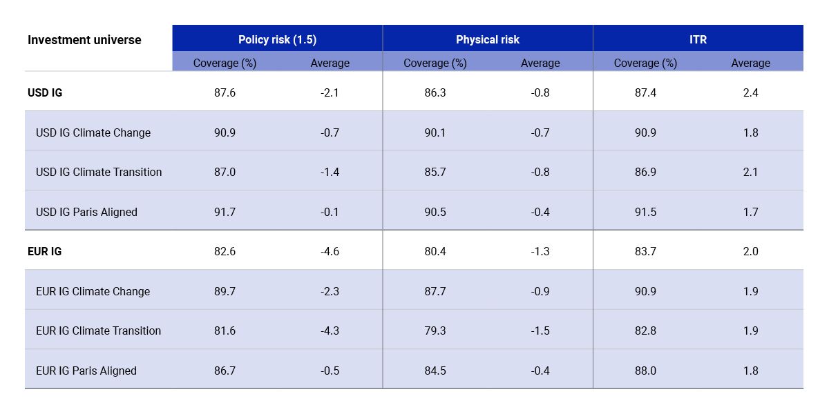 Source: MSCI ESG Research, as of Oct. 2, 2023. Coverage is a % of issuers with data; average is market-value-weighted average of issuers with data. Implied temperature rise is temperature rise in the year 2100 or later, if the whole economy had the same over/undershoot level of greenhouse gas emissions to the company analyzed. ITR = 2°C + relative carbon budget over/undershoot x Global 2°C x TCRE Factor (a transient climate response to cumulative emissions).  Policy-risk climate VaR is a company's debt-aggregated downside policy-risk exposure as a % of the market value of the company's debt, assuming a global 1.5°C target and using carbon prices from the AIM CGE model under the advance scenario. Physical-risk climate VaR is a company's debt worst-case (95th percentile) downside as a % of the market value of a company's debt, assuming trends in extreme weather conditions continue along a legacy scenario.