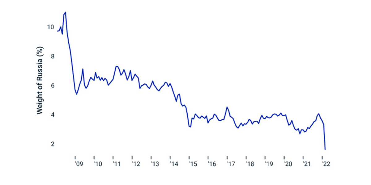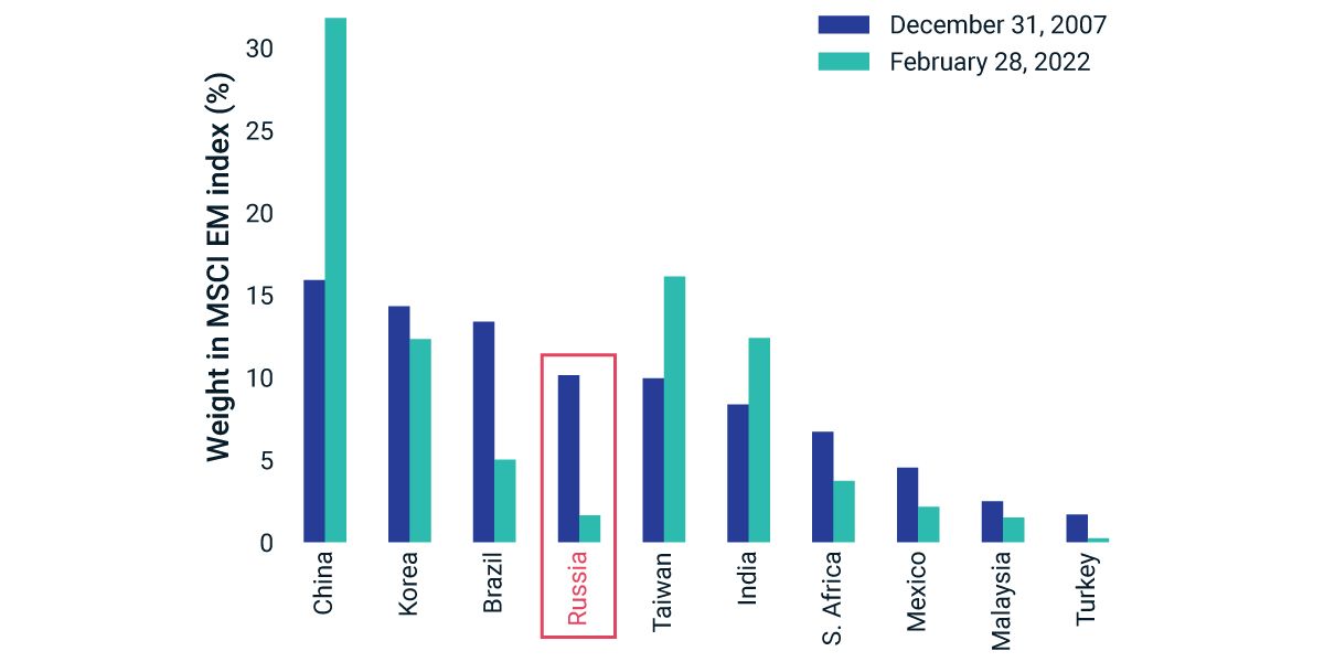 As investors weigh their options for EM allocations in the wake of Russia's invasion of Ukraine and reclassification, we ask how significant a role Russia has played within these markets — and more important, how that role has changed compared to the 2008 global financial crisis.
