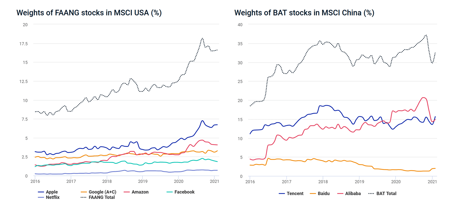 Digital technology in all its many forms is now an integral part of our lives. The companies that develop and promote its use have benefited from this trend, as have their share prices and market capitalizations. The strong performance of these companies has also led to increased concentration in the MSCI USA Index and MSCI China Index, as is clear in the charts below. In both cases, there has been a substantial increase over the last five years: with FAANG stocks having grown from slightly more than 8% to around 17% of MSCI USA, and BAT stocks having increased from a little over 18% to nearly 33% of MSCI China, as of Jan. 29, 2021.1 The effect of such concentration means that more of the performance and risk of each index can be driven by this smaller number of stocks, whose performance, in turn, tends to be driven, both positively and negatively, by similar factors and consumer trends. Investors may want to consider how this could impact diversification.