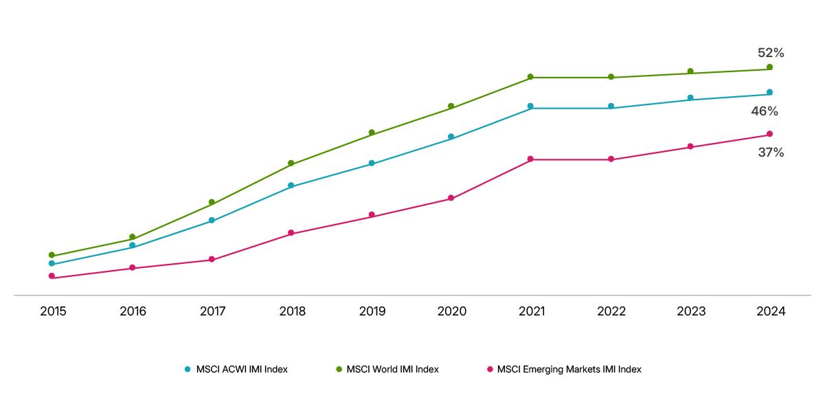 Corporate issuers' engagement with MSCI ESG Research has increased more than sixfold in the past decade. As of December 2024, 46% of all issuers in the MSCI ACWI Investable Market Index (IMI) universe proactively engaged with us, up from just 7% in 2015.