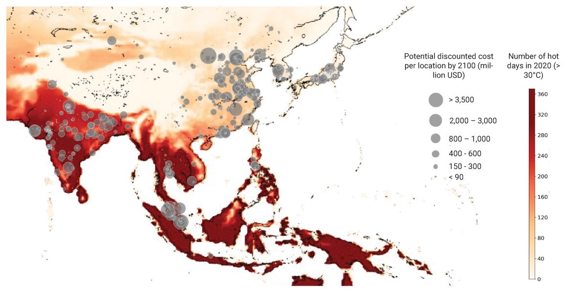 Notes: We compared 2020 heat exposure in selected regions with potential discounted costs by 2100. We selected the 5°C IPCC SSP5-8.5 scenario, assuming a hothouse world to have a worst-case cost estimation. The asset-level discounted costs did not always match the heat-exposure map due to variation of increased hot days between now and 2100, location and the vulnerability of each asset location.