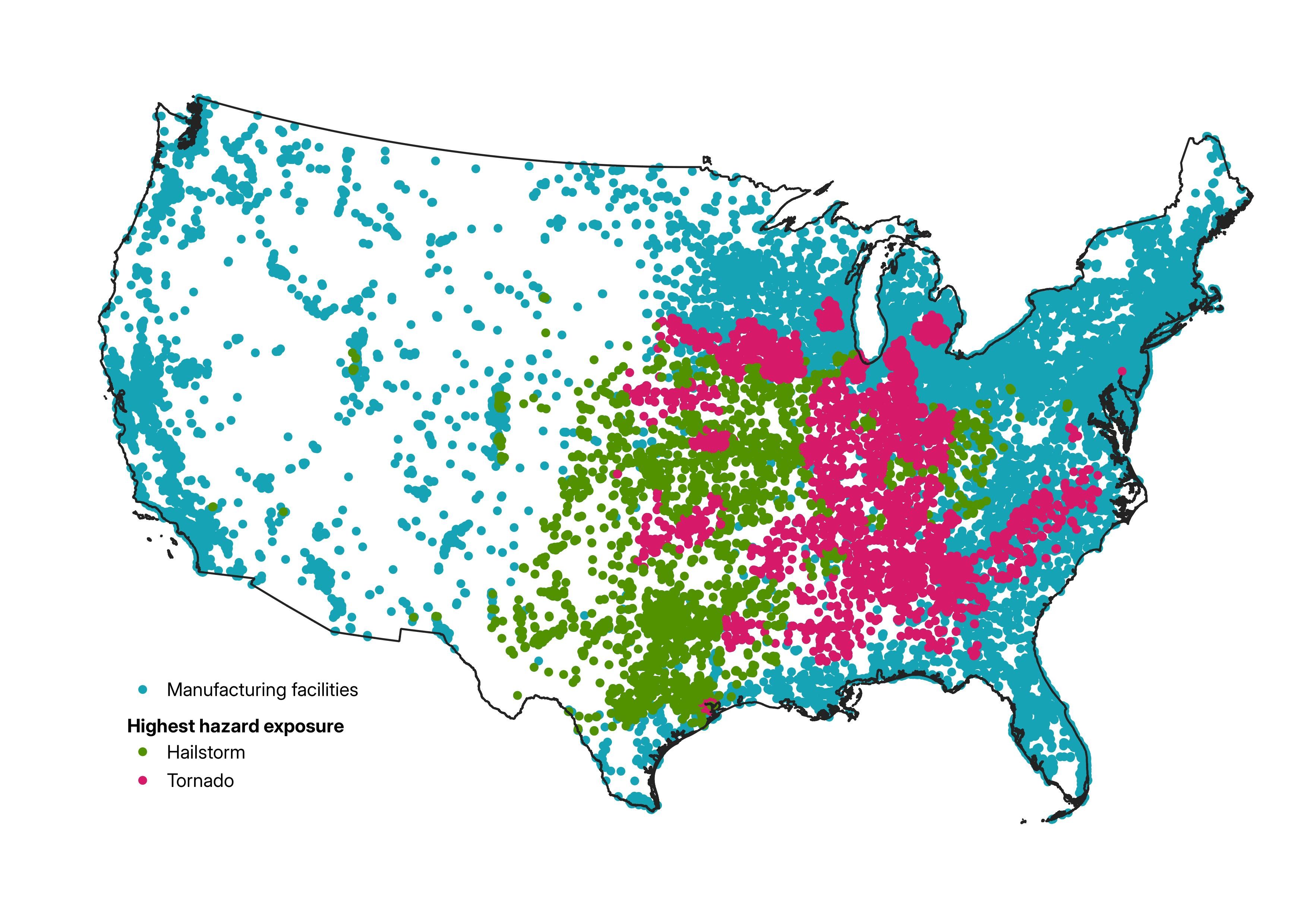Identifying sectors where manufacturing facilities face heightened physical risk relies on assessing these risks at the location level. Over one quarter (28%) of U.S. manufacturing sites have greater exposure to tornadoes or hailstorms compared to any other hazard. As the map shows, these sites are heavily concentrated in the eastern two-thirds of the country, where such events are most frequent.