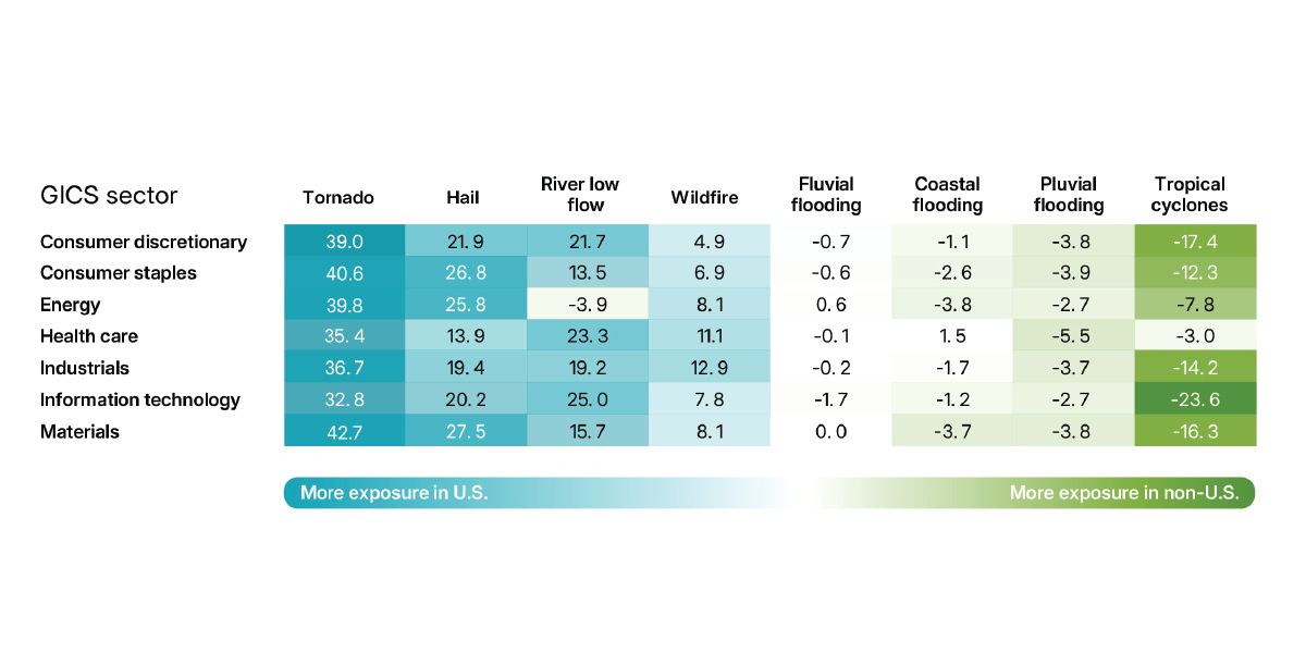 Across all sectors, U.S.-based facilities face elevated risks from acute hazards such as tornadoes, hailstorms and wildfires compared to their global counterparts, as shown in the table. Higher tornado and hailstorm risks are particularly pronounced in the materials, consumer discretionary, consumer staples and energy sectors.
