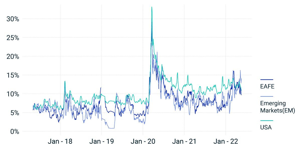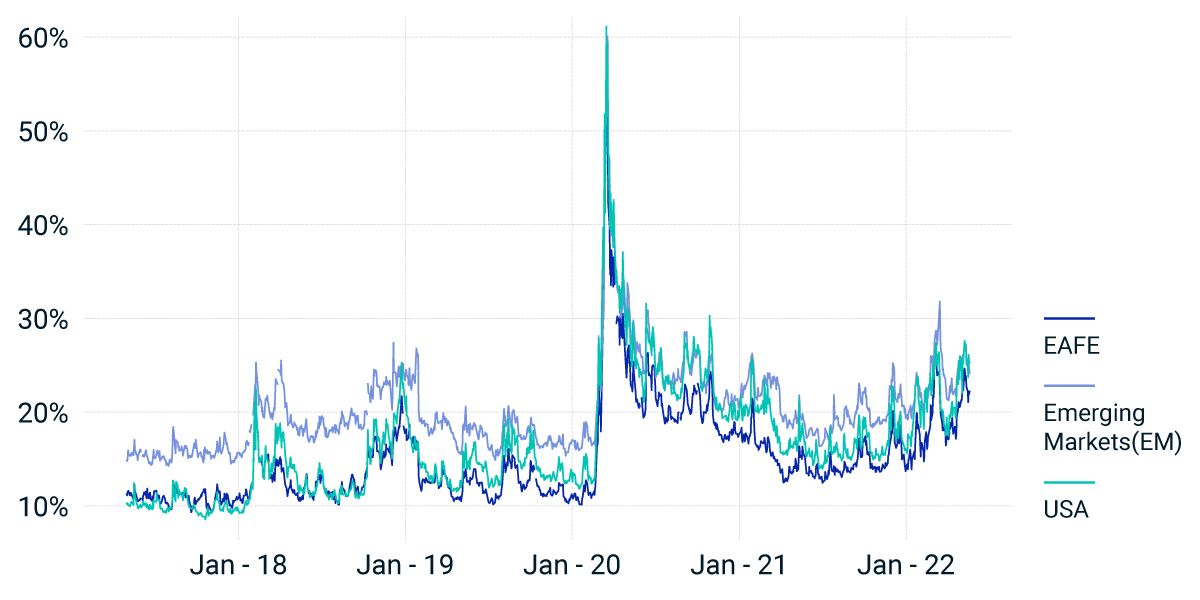 Implied volatility is based on the average implied volatility of 91-day ATM call and put options from May 1, 2017 to May 20, 2022. Source: Optionmetrics.