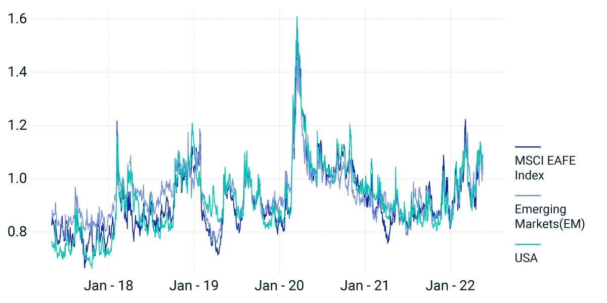 - Heightened levels of implied volatility Three-month implied volatility across regions remained elevated, with levels in the top decile, 91st percentile, for EAFE and the U.S., and around the 83rd percentile for EM, based on 5-years of history.2 For the U.S., the current levels stood at 88th percentile based on data since January 2000. (See chart one.)