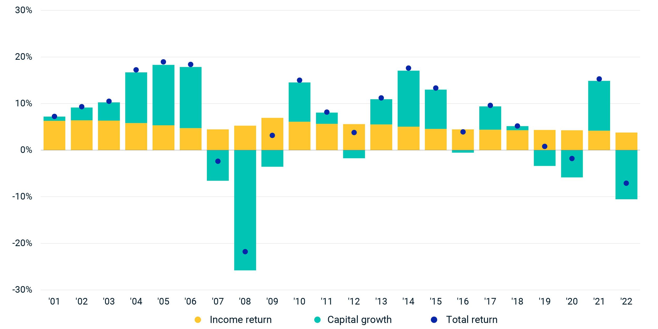 In contrast to what we have seen in the higher-frequency index releases, the annual index's results avoided the lows of the 2008 global financial crisis (GFC), when returns dropped below -20%. The less frequent valuation cycle skipped over the final few months of capital growth in the first half of 2022 and limited the decline in returns.