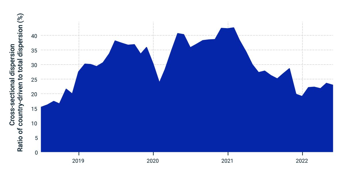 Through cross-sectional dispersion of stock-specific returns, we see that the opportunity for active managers to outperform the market through stock selection has increased over the past 12 months (as compared to the prior two years). Cross-sectional dispersion of returns measures volatility across equities over a single period. Total cross-sectional dispersion can then be decomposed into different sources of risk, including country/market, industry, style factors and stock-specific risk.