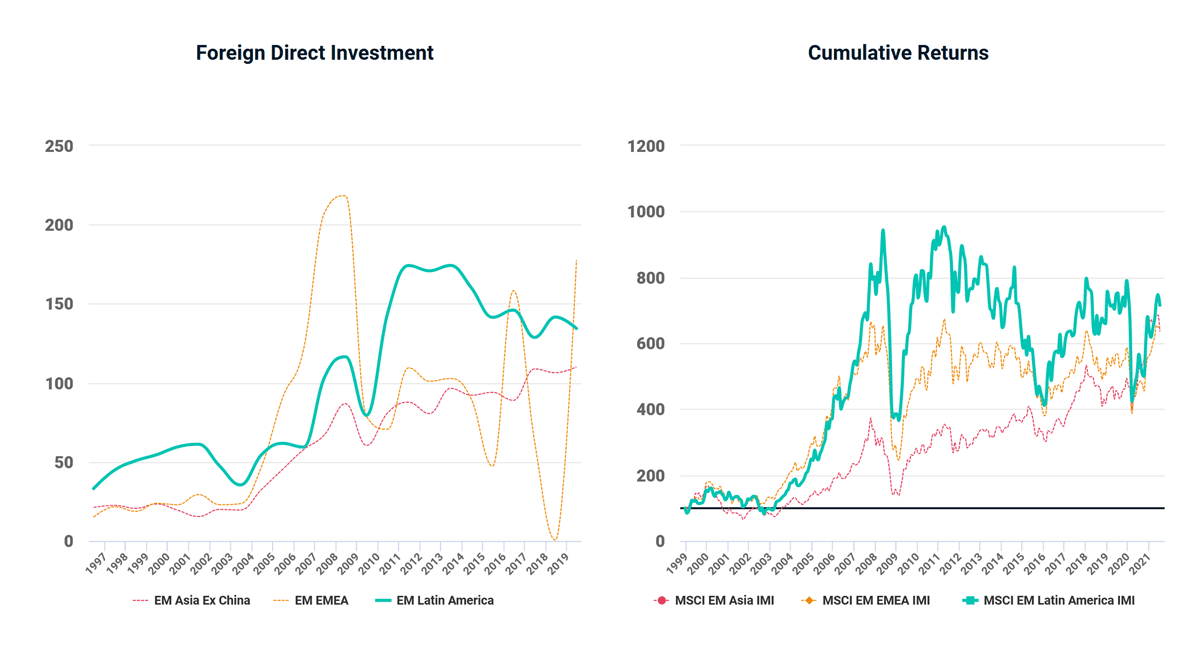 Latin American stock markets have recovered strongly as the world starts to overcome some of the COVID-19 pandemic's challenges — renewing interest in the region. Over the past 20 years, Latin America has steadily become a favored destination in terms of foreign direct investment, compared to other emerging-market (EM) regions such as EM EMEA and EM Asia ex China. Foreign direct investment has been a catalyst to development, income and employment growth in the region, even though pandemic-driven closures and a slowdown in activity have had a negative impact on the most recent measurements. From a stock-market perspective, the MSCI EM Latin America Investable Market Index, which covers large-, mid- and small-cap stocks, showed the highest average annualized returns among emerging markets during this period. The region also has seen improvements in access to technology, education and literacy and become more integrated in global trade. Over the last two decades, the middle class has expanded and the number of people living in poverty in the region fallen by nearly half. In addition to these structural changes, there is a cyclical story, which is linked to the recovery of the commodity cycle and its potentially positive impact on local economic growth. Given these unique characteristics, investors could consider Latin America as a differentiated block in their EM allocations.