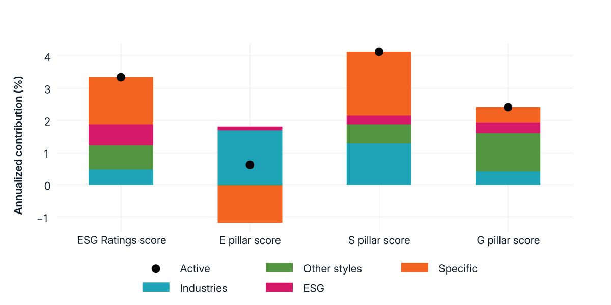 Data from Dec. 31, 2012, to Dec. 31, 2024. Equal-weighted quintiles are created every month based on adjusted scores in the MSCI Japan Index. Each quintile comprises an average number of 60 securities across the analysis period. Scores are first standardized by Global Industry Classification Standard (GICS®) sector and then size adjusted. (GICS is the global industry-classification standard jointly developed by MSCI and S&P Global Market Intelligence.) The graph shows performance attribution of active return of top quintiles versus bottom quintiles using the MSCI Japan Equity Factor model. Source: MSCI ESG Research