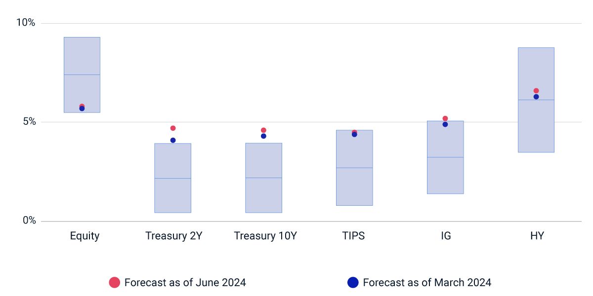 Against this backdrop, we updated our macroeconomic scenarios to reflect the latest macro and market data. Under the baseline soft-landing scenario, one-year expected returns for the U.S. equity market are similar to those in the previous quarter and remain at the lower end of their historical range. One-year expected returns for U.S. bonds have slightly increased, further narrowing the gap with equities and placing them at the higher end of the historical range (as shown in the exhibit below).