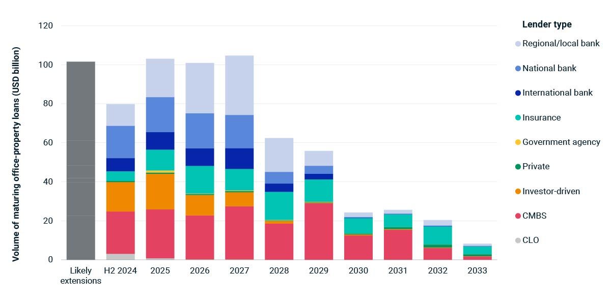 As of June 30, 2024, U.S. office-property loans set to mature in the second half of 2024 totaled about USD 80 billion, according to MSCI Mortgage Debt Intelligence data. Additionally, about USD 100 billion of office loans were slated to come due in 2023 or in the first half of 2024 but, according to our analysis, were not subsequently refinanced and no sale of the associated collateral occurred. We have deemed these loans "likely extensions."