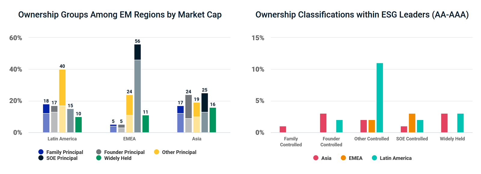 To take this analysis a step further, we sorted the companies classified as ESG Leaders (ESG rating AA to AAA) by ownership structure, as shown in below. We see that most Latin American ESG Leaders were in the "other controlled" category (11%), which was the highest share in this category across all regions. In addition, the second most common ownership structure in LATAM was "widely held." At 3%, this was in line with ESG Leaders in Asia, but the EMEA region had no firms in this category.