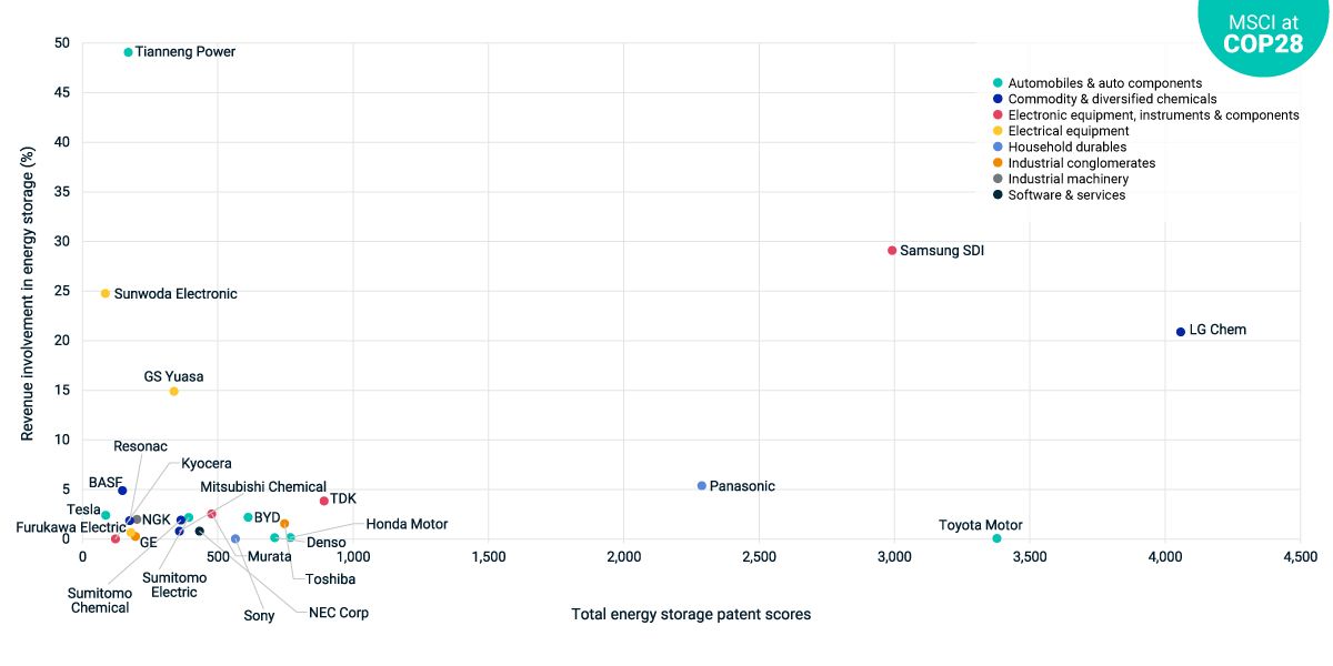 Top 25 companies ranked by patent scores in energy storage. Companies had to have revenue involvement in energy storage to be included. Data as of Nov. 20, 2023. Source: MSCI ESG Research