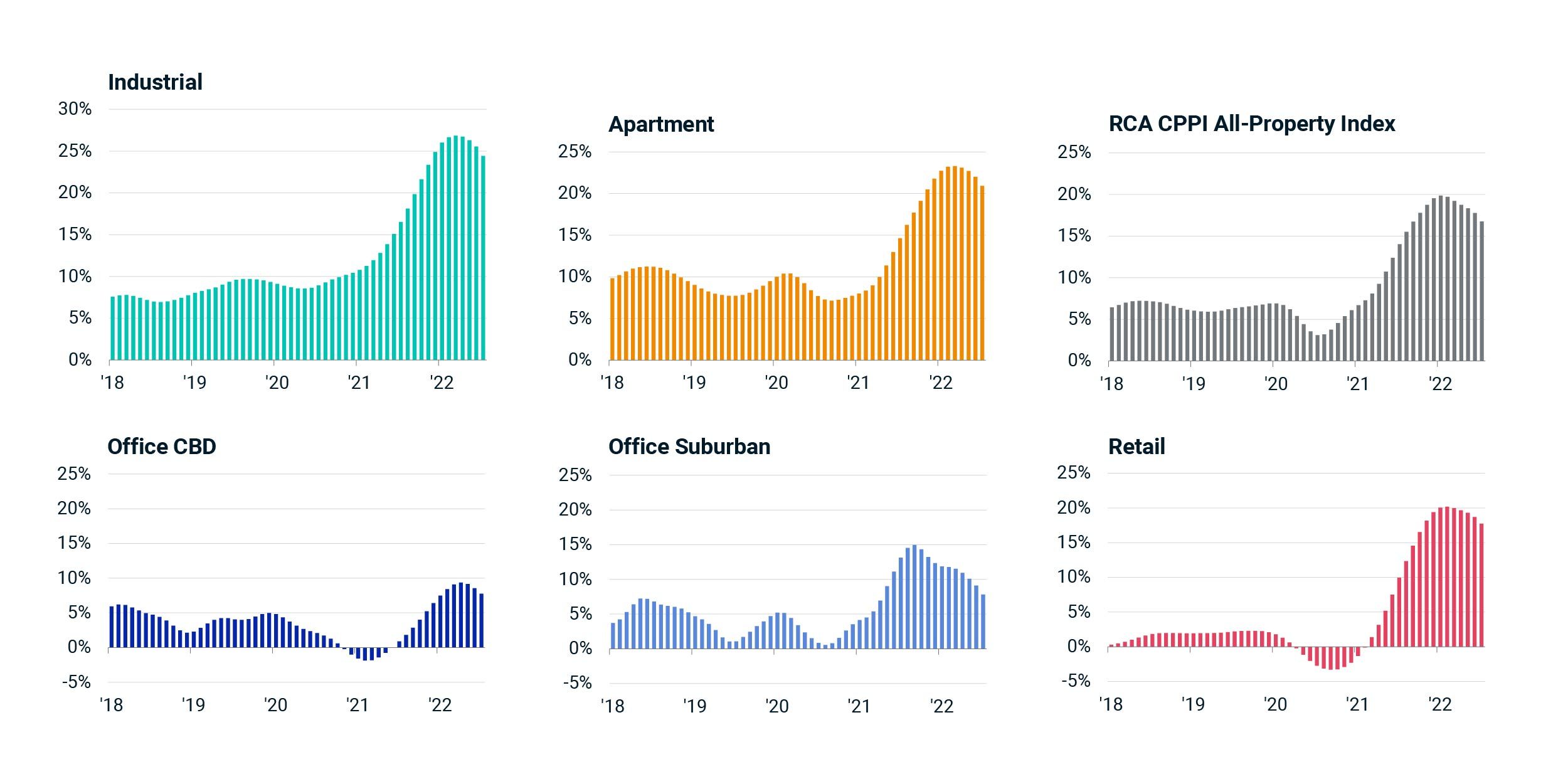 The pace of annual price growth across all major U.S. commercial property types faded in July, though most RCA CPPI indexes still showed double-digit gains. The RCA CPPI National All-Property Index rose 16.8% from a year ago, marking a continued slowdown from the record rates seen at the start of 2022.