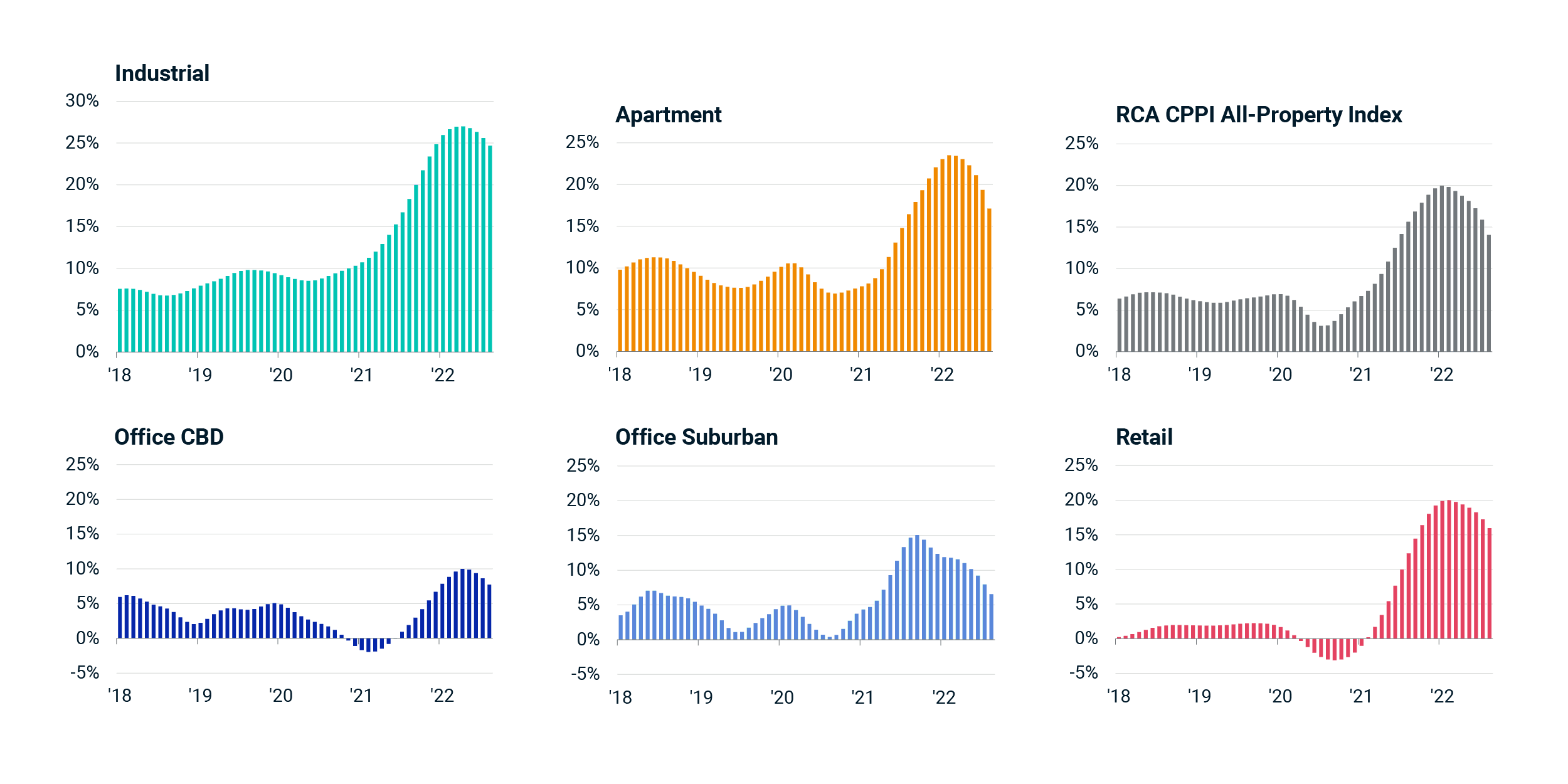 The prices of U.S. commercial properties that sold in August continued to climb but at a slower pace than seen in recent months. The RCA CPPI National All-Property Index increased 14.0% from a year prior, down from the record-high 20.0% rate at the start of 2022 and marking the seventh consecutive month of decelerating growth.