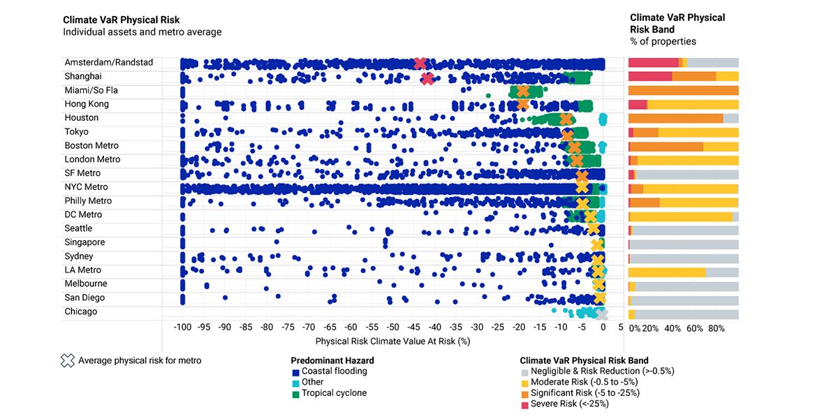 Using MSCI's Real Capital Analytics database of global real estate holdings and MSCI Real Assets Climate Analysis, we can see a broad range of aggregated physical climate value-at-risk (VaR) across selected global cities, as shown in the chart below, but these risks are not equally distributed within each city. Investors need to appreciate this wide variation of risk in each market.