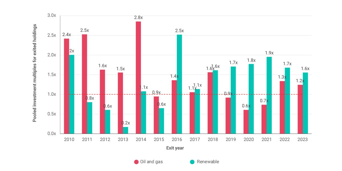 In recent years, private funds' exits from renewable investments have generated higher pooled2 investment multiples3 (gross of fees) compared to exits in oil and gas. Looking at the investment multiples, which compared the total investments and the total proceeds at the holding level, renewable exits outperformed oil and gas in every year between 2016 and 2023, as of Q4 2023.