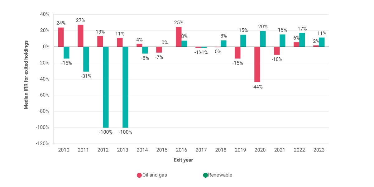 To incorporate the role of cash-flow timing in the returns, we looked at the internal rate of return (IRR) (gross of fees) for both sub-industry groups. Our findings suggest that the median IRRs for the exited renewable and oil-and-gas investments were, for the most part, directionally in line with the investment-multiples findings, further reinforcing the outlined outperformance, as of Q4 2023.