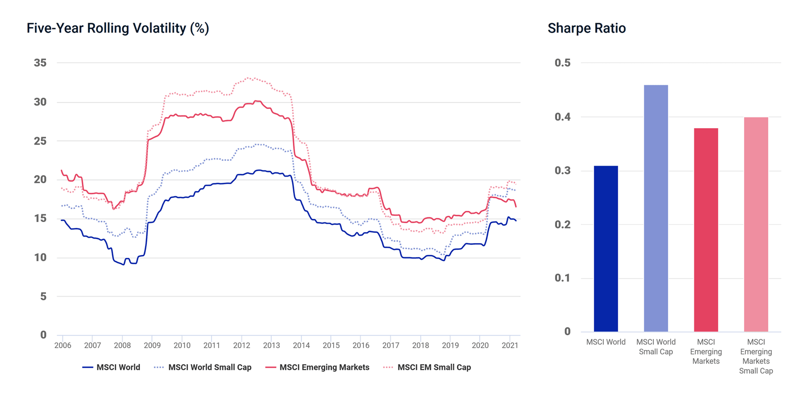 The first chart shows rolling historical volatility for both developed- and emerging-market indexes and their small-cap equivalents. We can see an impact of last year's increase in volatility, especially in small caps, but it was modest compared to the impact during the 2008 global financial crisis and the recession that followed. For most of the last 20 years, the MSCI World Small Cap Index had a five-year historical volatility (annualized) that was higher than that of the MSCI World Index (on average 2.5%). Volatility for the MSCI Emerging Markets Index remained closer to the volatility of the MSCI Emerging Markets Small Cap Index.