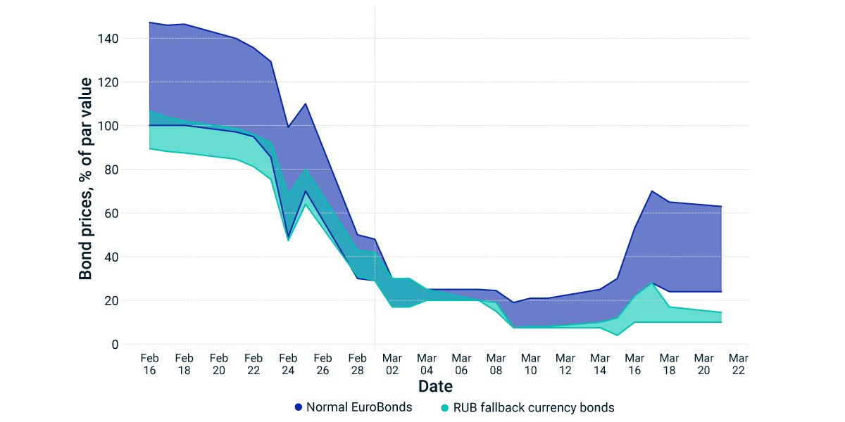 Despite uncertainty around whether sanctions will bar creditors from receiving payments, Russia paid USD 117 million of interest due for two Russian hard-currency bonds, on March 16. Additionally, spreads of credit-default swaps (CDS) on Russian sovereign debt — the cost of insuring against default — have also recovered. After peaking during the week of March 11, CDS-implied default probabilities have steadily declined, from a high near 80% to a more moderate but still substantial 50% on the 1-year horizon. A similar trend emerged in the bond market. Even though trading in Russian debt is suspended on most exchanges, reported bond prices indicated a bounce back. While reported bond prices were no higher than 25% of par value two weeks ago, many Russian bonds rallied to levels above 40, and some as high as 70 for bonds close to maturity, as of March 21. The uptick was muted more for so-called fallback currency bonds, which contain a special clause that allows the issuer to make payments in rubles as an alternative currency. These bonds were priced below 20. We note that there is a high level of uncertainty around the prices observed in this market.