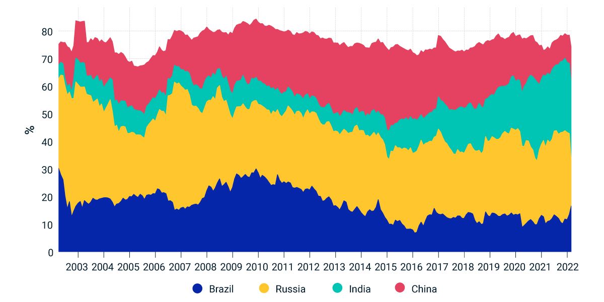 Even before the imposition of global sanctions on Russia in response to its invasion of Ukraine, Russia was far from its high point of a nearly 50% weighting in the MSCI EM Energy Index 20 years ago, when the term BRIC— Brazil, Russia, India and China — was first coined. That said, at a 30% weighting, it was still the largest country in the sector index at the end of 2021.