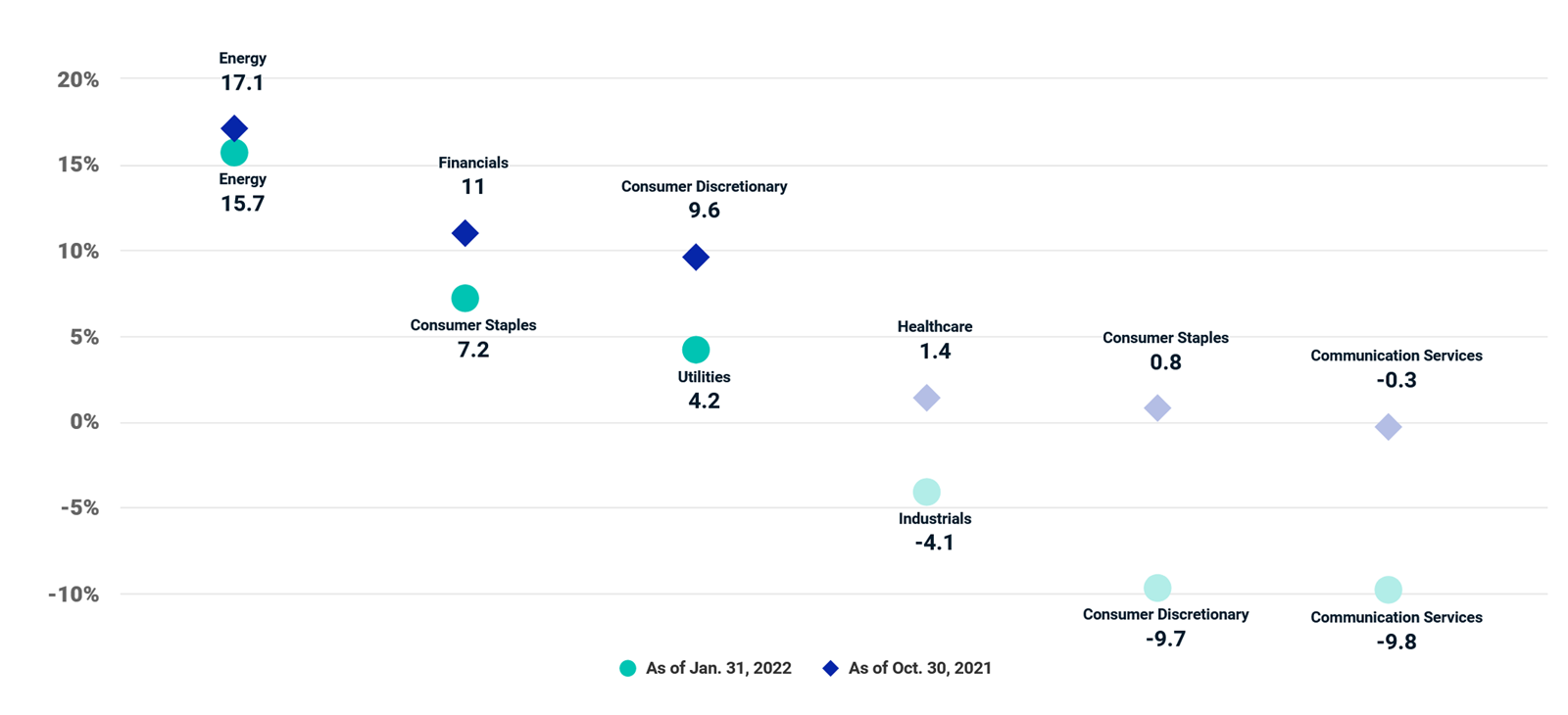 In the chart below, for example, we look at the best- and worst-performing sectors for the periods shown. For the three-month period ended Oct. 30, 2021, the performance difference between the top and bottom sectors was 17.4%. For the three months ended Jan. 31, 2022, it was significantly higher, at 25.5%.