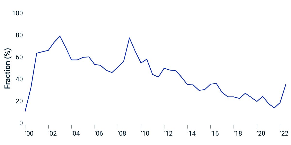 Share of firms in the MSCI USA IMI Technology Index in a 50% drawdown from their previous high.