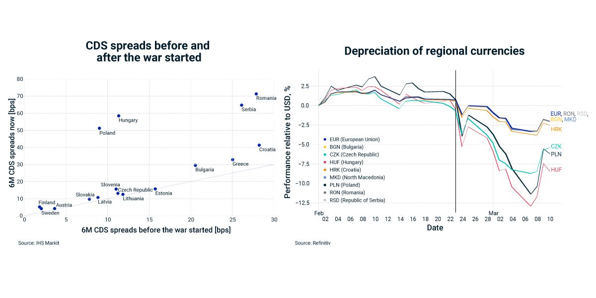 We looked at the spreads of Eastern European countries' sovereign-bond credit-default swaps (CDS) and found that the cost of protection increased from prewar levels in every case, through March 10, indicating elevated expectations of default. We saw the greatest spread increases (around 40 basis points) in Poland, Hungary, Romania and Serbia. These four countries either have strong economic ties to Russia or are geographically close to the conflict.