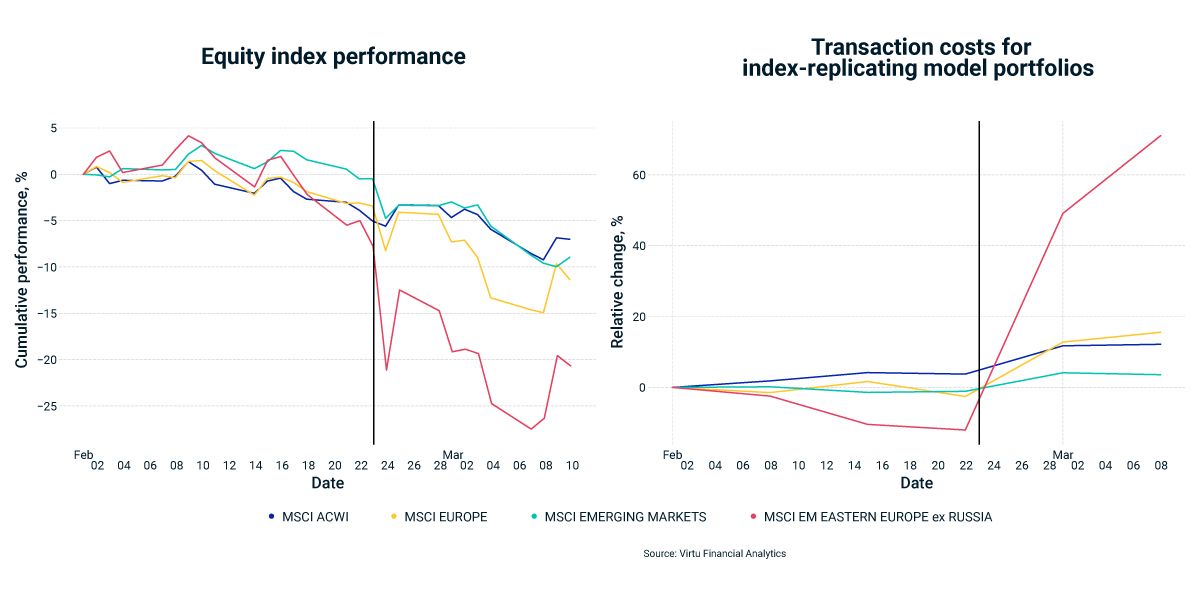 Equity investors seem to have rushed to decrease their exposure to these markets as well. The performance of the MSCI EM Eastern Europe ex Russia Index — versus the broader MSCI ACWI, Europe and Emerging Markets Indexes — points to a regional sell-off over the past few weeks. For a hypothetical portfolio based on the Eastern Europe index, we also observed significantly higher transaction costs than for the broad-market indexes. That could be another sign the market turmoil has spread beyond the countries at war.