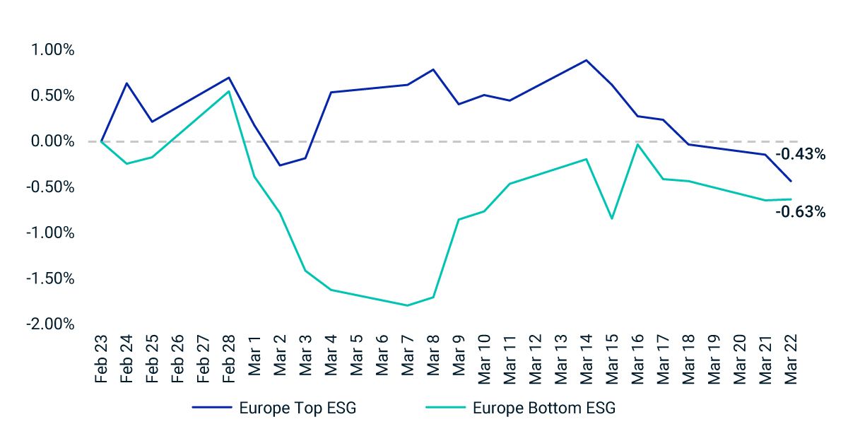 Cumulative active return for top/bottom ESG quintiles of constituents of the MSCI Europe Index, from Feb. 23 to March 22, 2022.