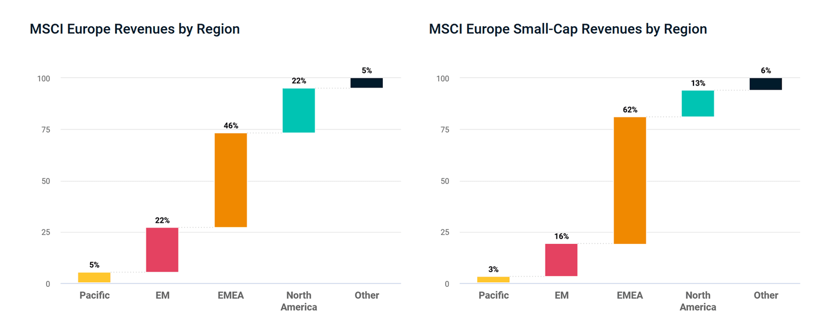 The chart below draws on MSCI Economic Exposure data to show the breakdown of revenues by region of origin for the MSCI Europe and the MSCI Europe Small Cap Indexes. We can see that the small-cap index had greater exposure to revenues that originated in the region (62% vs. 46% for MSCI Europe.