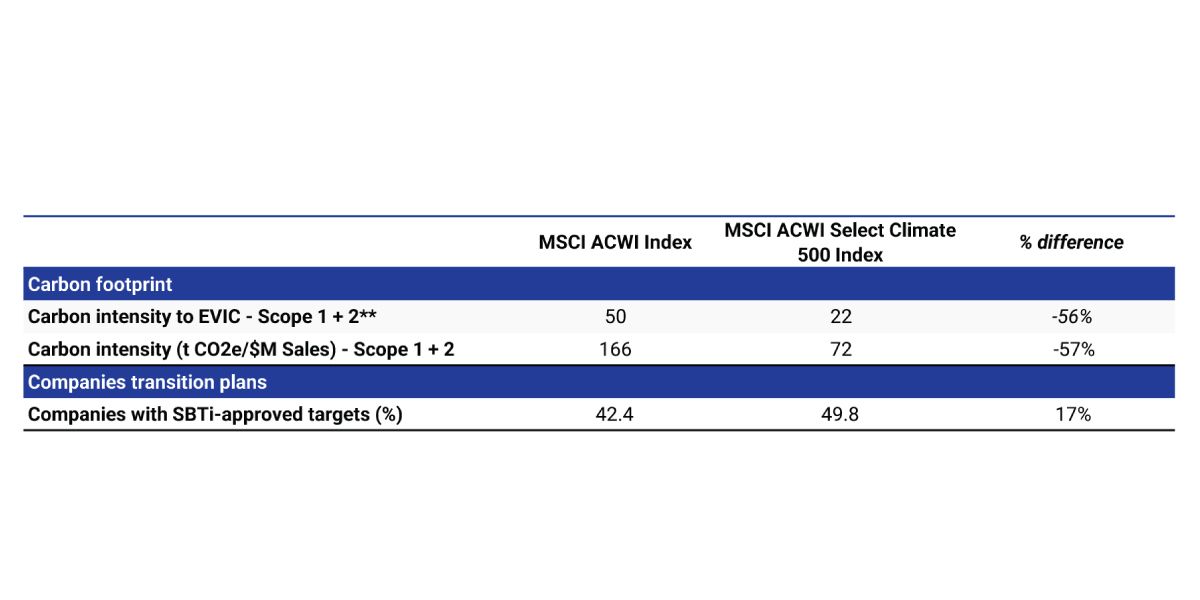 The MSCI ACWI Select Climate 500 Index (the ‘Index’) is designed to support investors seeking to reduce their exposure to the greenhouse gas emissions and increase exposure to companies with their emission reduction targets approved by Science Based Targets initiative (SBTi)